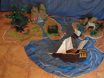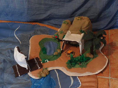 Je me suis dit que c'était une super idée pour mon centre de loisirs. Le thème des vacances de printemps était "Les aventures de Robinson Crusoë !" alors j'ai décidé d'en créer un pour les vacances. Souvent, le tapis va avec un livre sauf que moi, je voulais en faire un qui puisse bouger, évoluer et permettre de faire plusieurs histoires ... Alors, j'ai décidé de faire des éléments séparés que l'on "combine" selon les besoins.