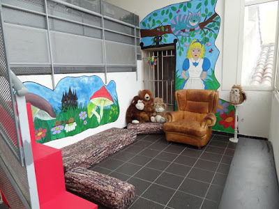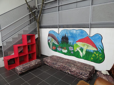 En plus, de toute cette "couture", j'ai aussi aménagé un nouvel espace bibliothèque pour les histoires dans notre centre. J'ai peint des fresques sur le thème d'Alice au pays des merveilles, j'ai fait des canapés, des poufs et des coussins pour rendre le coin confortable.