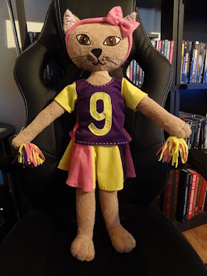 Depuis j'ai fait une petite Ouette, une mascotte petite chatte pom-pom girl ... à partir du dessin de Zohra qui avait dessiné la mascotte de ses rêves et que sa maman lui a fait faire pour son anniversaire.